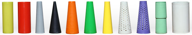 Conos estándar, conos perforados especiales para vaporizado y teñido, conos para tejidos de punto, carreteles, tubos para texturizado, conos y cilindros para telares sin lanzadera, con o sin tratamiento superficial de gamuzado (Peeling)